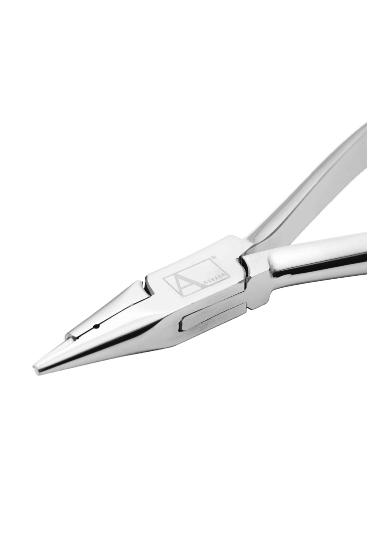 Ein äußerst präzises Instrument mit einer schmalen, speziell geformten Spitze. Es wird verwendet, um Haken und Ösen an den Enden von Drahtspangen zu formen. Die Rundzange besitzt zwei unterschiedliche Enden: eine flache, gezahnte Seite und eine glatte, konische Spitze.